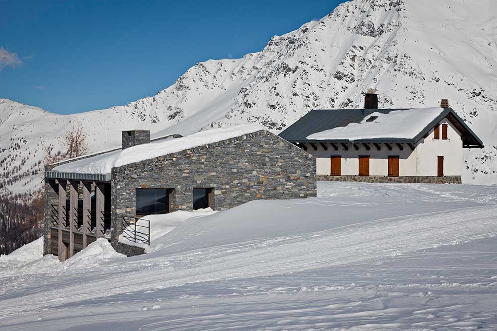 Partendo dalla ristrutturazione di un rustico, l’intervento dell’architetto e designer di origini biellesi Federico Delrosso ha prodotto un nuovo volume architettonico pulito e compatto che esalta la forza espressiva della struttura primaria in pietra a secco, tipica delle costruzioni di alta montagna, qui dichiaratamente rivisitata.