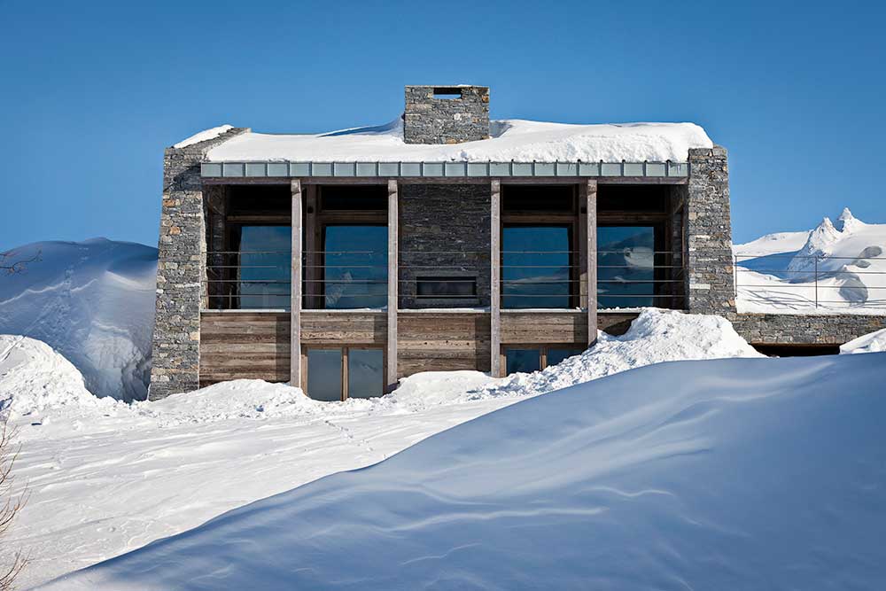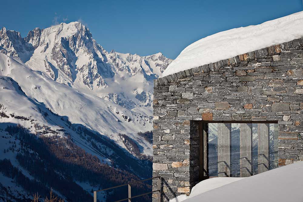 L’edifico su due livelli si presenta con l’involucro primario in pietra che contiene la struttura del tetto, che si scarica a terra sul fronte principale con una scansione verticale. Questa, a sua volta, viene ripresa sul piano arretrato con infissi a tutta altezza che offrono una spettacolare apertura totale sul paesaggio. Anche l’orientamento della casa privilegia la vista più suggestiva, verso il monte Bianco.