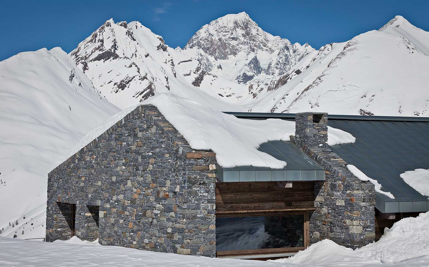 Un edificio minimale, integrato nel paesaggio alpino della Val d’Aosta, a oltre 2.000 metri di altezza sulle pendici del monte Bianco nel vallone di La Thuile – località Les Souches.