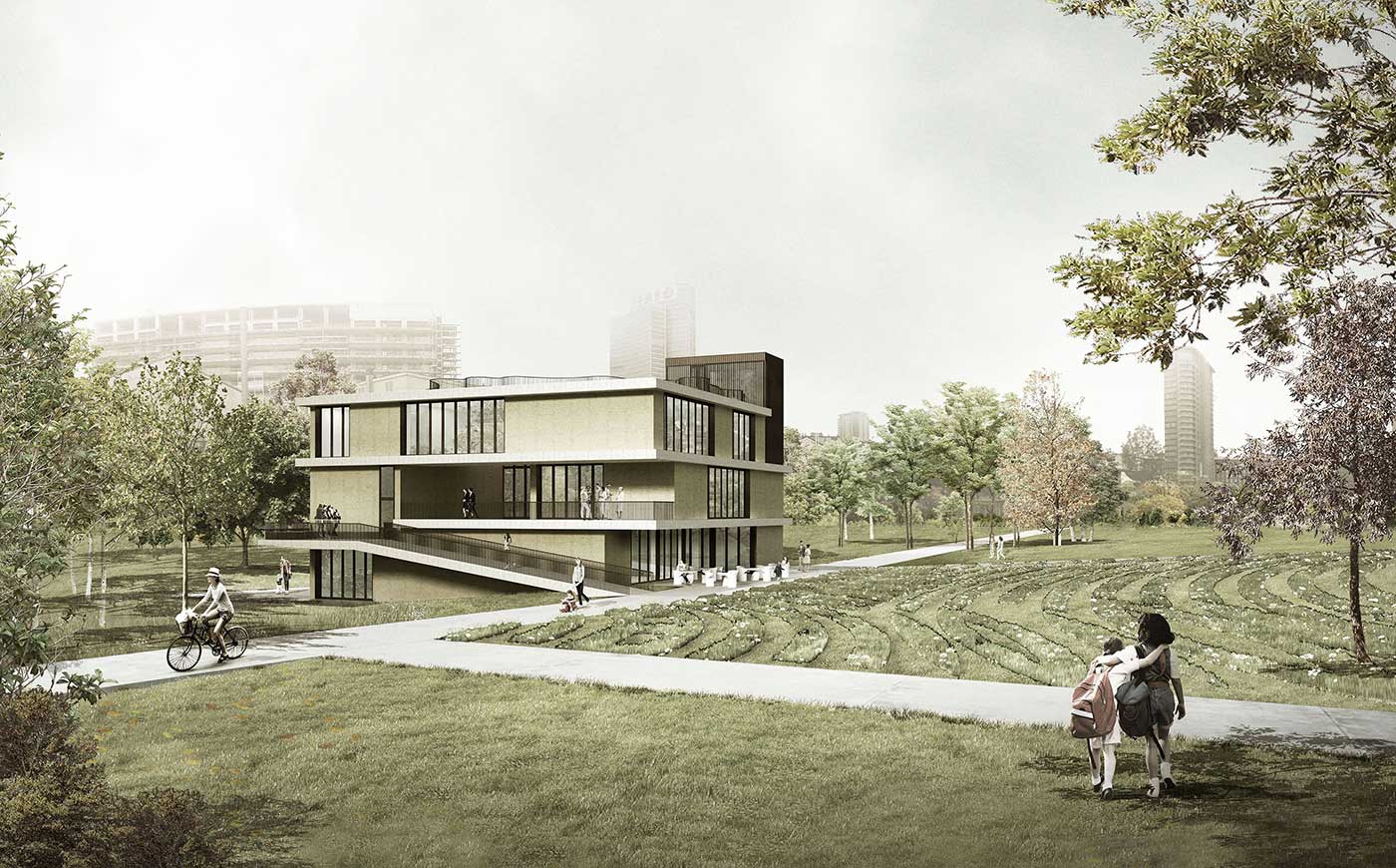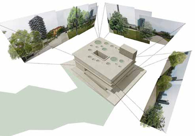 Fondamentale importanza per la definizione dell’edificio è assunta dal rapporto con il parco, elemento generatore e al contempo sfondo dell’architettura, uno spazio pubblico animato da un intreccio di percorsi pedonali che si snodano fra le diverse specie botaniche (Biblioteca degli alberi) e gruppi di alberi disposti a cerchi (Foreste circolari).