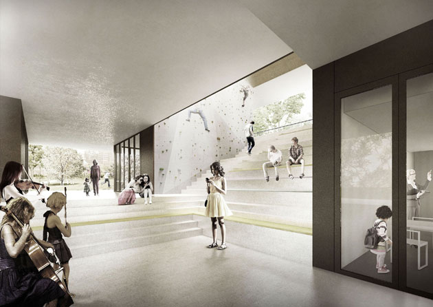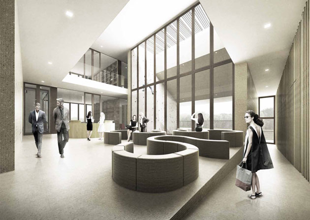 Nel render dello studio Km429, la piazza coperta che sorgerà al piano terra del nuovo Centro Civico