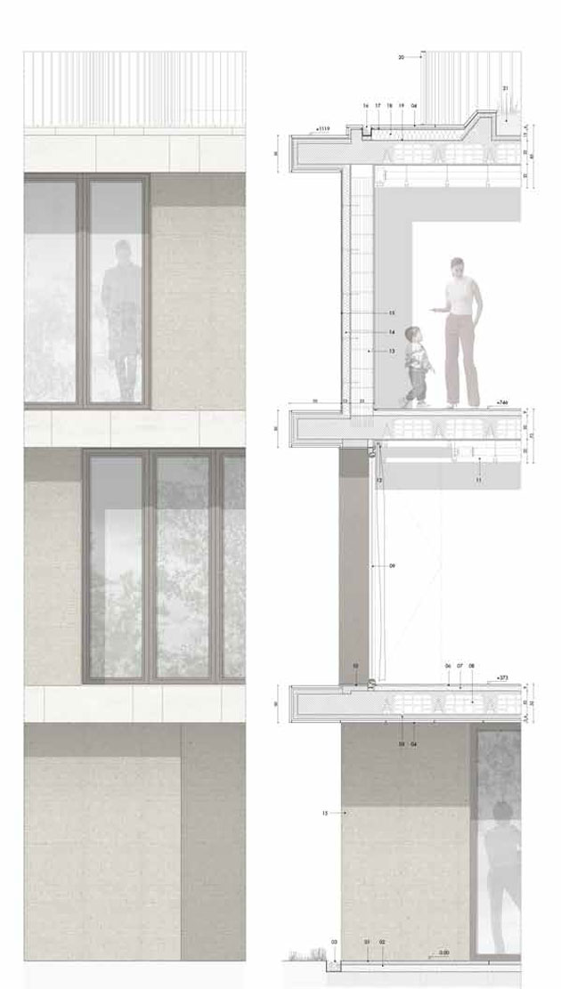 Dettaglio di sezione dei fronti dell´edificio, caratterizzati da marcapiano aggettanti