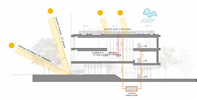 Il progetto è concepito secondo i più severi criteri di sostenibilità ambientale e di salubrità per i futuri utenti e per essere certificato in classe energetica A. La semplicità compositiva dell’edificio si riflette anche nella filosofia costruttiva: la struttura sarà composta da pilastri e setti in cemento armato e ogni ambiente disporrà di controsoffittature che consentiranno la massima flessibilità e modificabilità nel tempo, oltre a consentire una distribuzione degli impianti orizzontale di facile manutenzione. Le strutture opache saranno realizzate con blocchi di tamponamento in laterizio alveolare e lastre di EPS per l’isolamento termico, mentre le vetrate esterne prevedono serramenti a taglio termico con vetri basso-emissivi.