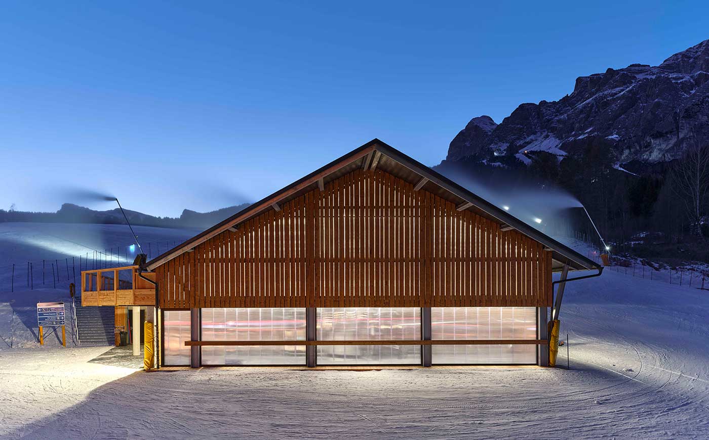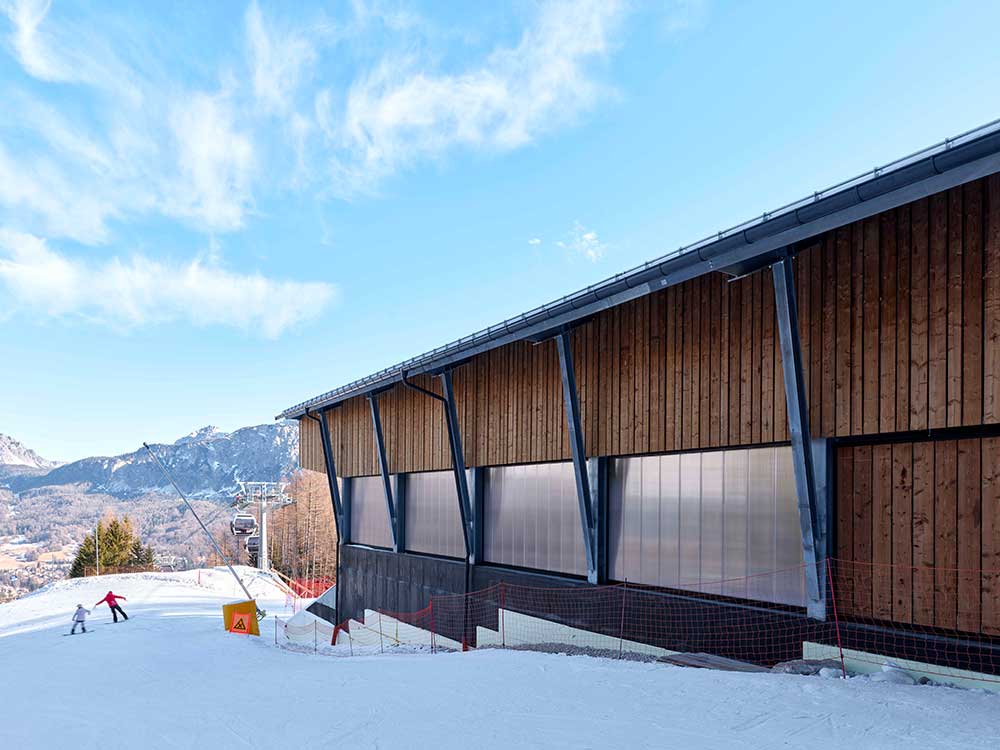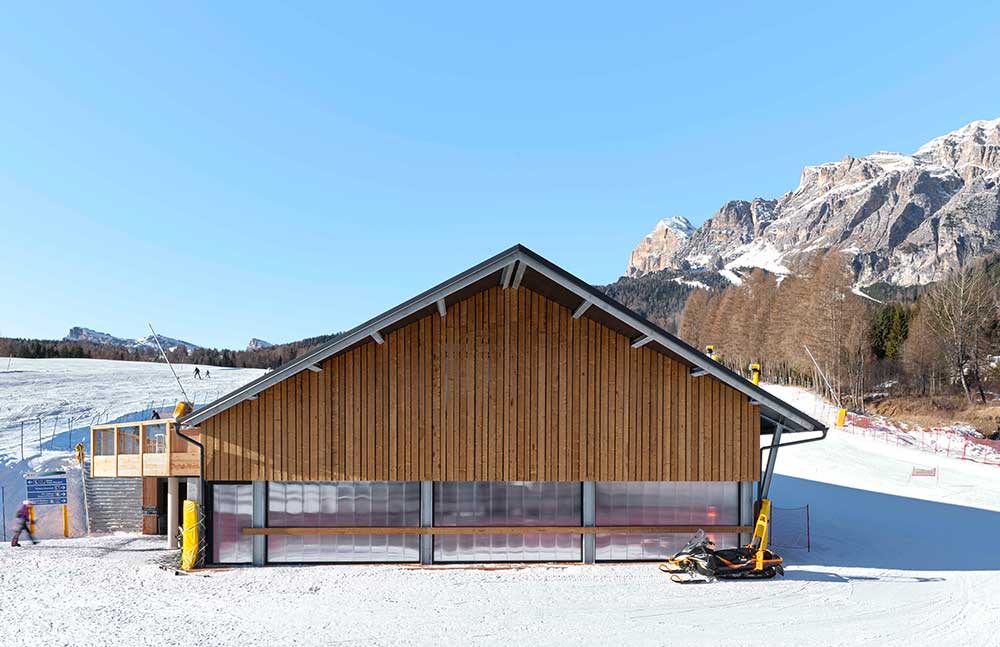 Disegno archetipico e materiali semplici – legno, policarbonato e zinco-titanio in copertura – per le stazioni della cabinovia inaugurata a dicembre che dai 1.335 metri di Socrepes arriva a Lacedel (1.558 m) e, con 53 cabine a 10 posti, sostituisce le precedenti seggiovie.