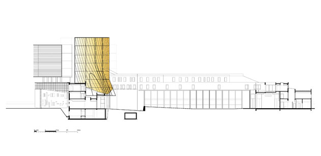 Sezione trasversale e longitudinale del complesso. In evidenza la facciata in vetro dorato della torre di servizio. |