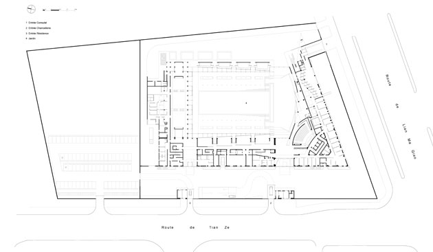 Un complesso di 20mila mq che comprende la Cancelleria, il Consolato, una zona-residence per il personale e gli appartamenti privati dell’ambasciatore. Inaugurata nell’autunno 2011, l’enclave diplomatica è stata costruita in otto anni, concepita come una struttura concentrica formata dalla cinta muraria, che delimita gli edifici e il giardino interno. Il progetto è una fusione di soluzioni razionali in termini di efficienza energetica e regole del Feng Shui, l’antica arte dell’abitare orientale. Le scelte funzionali ed estetiche sono il risultato di un approccio bioclimatico all’architettura che ha tenuto conto delle specificità del luogo e dell’azione degli elementi naturali: l’orientamento degli elementi è stato dunque il punto di partenza del complesso in un processo di progettazione olistico. L’ambasciata funge da “sentinella” al nuovo quartiere diplomatico, situato fuori dal centro di Pechino e in prossimità della terza circonvallazione, in direzione dell’aeroporto. L’enclave francese è circondata da una cinta muraria, elemento simbolico che rimanda alla Città Proibita situata nel cuore della capitale cinese. Come il Palazzo Imperiale, anche il complesso dell’ambasciata ha una struttura concentrica in cui ogni spazio chiuso è controbilanciato da uno spazio aperto. Le caratteristiche della tradizione orientale si riallacciano a elementi della cultura occidentale, come la disposizione degli edifici intorno a un giardino centrale, omaggio alla cultura cartesiana di rigore ed eleganza.