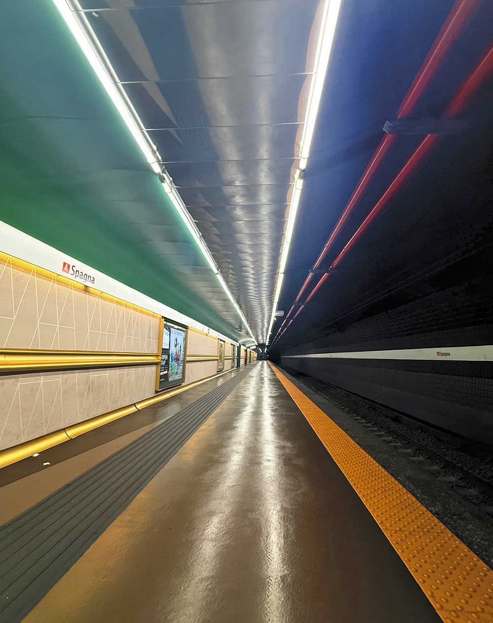 I nuovi rivestimenti della fermata Spagna della Metro 1 di Roma. I lavori completati a fine 2024 hanno interessato una superficie di circa 5000 metri quadri compreso il corridoio di collegamento con Villa Borghese.