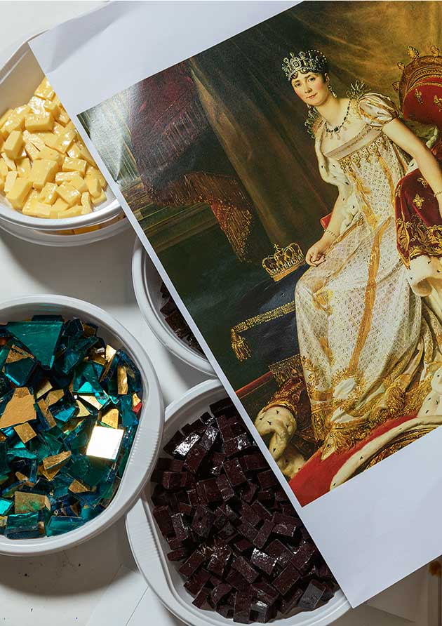 vetri smaltati e oro scelti da Friul Mosaic per riprodurre il più fedelmente possibile i colori del ritratto originale |