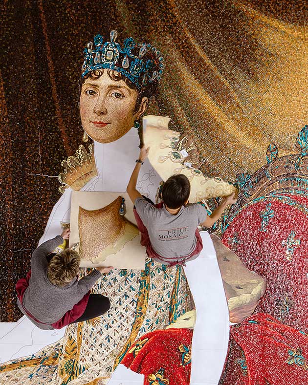 «La sfida – prosegue Barbara Bertoia – è stata quella di adattare l’opera pittorica alle esigenze tecniche dell’arte musiva. Per essere il più possibile fedeli all’originale in termini di colori, dettagli ed effetto finale, abbiamo utilizzato gli smalti veneziani che con la loro vasta gamma di colori ci hanno consentito di creare sfumature e dettagli minuziosi dei tessuti e dei mantelli. Abbiamo utilizzato anche una buona quantità di ori veneziani per dare risalto alle corone e ai gioielli oltre che ai dettagli dei troni e delle vesti delle due figure. Il numero di tessere è davvero difficile da quantificare anche perché per la realizzazione dei volti e dei vestiti abbiamo utilizzato la tecnica del micromosaico, l’unica in grado di riprodurre così fedelmente i due dipinti».