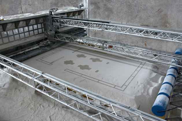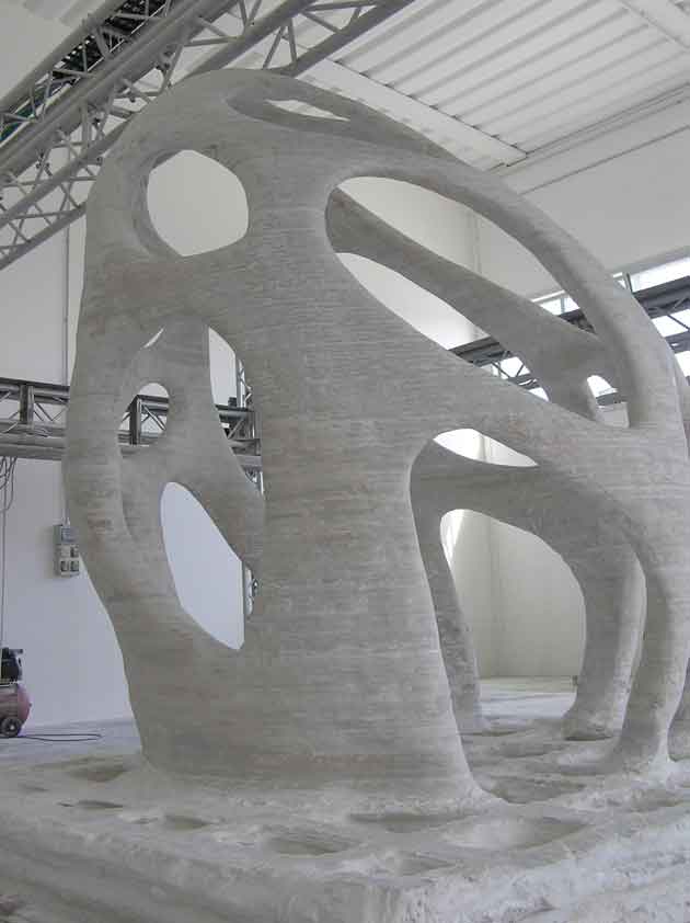 Dall’idea al progetto CAD alla realizzazione. La stampante di Enrico Dini trasforma la sabbia in roccia e permette di produrre le forme più complesse al ritmo di un millimetro al minuto, senza inquinare e a chilometri zero. Il principio è semplice e già noto, tanto che nel giro di un paio d’anni le stampanti 3D, per costo e accessibilità, saranno un bene di consumo di massa. Utili però per “stampare” piccoli oggetti e utilizzando prevalentemente resine epossidiche. Ma il progetto che l’ingegnere toscano Enrico Dini persegue da anni è più ambizioso e si confronta direttamente con la produzione edile. Non si tratta soltanto di un salto di scala (la sua Monolite con testa di stampa a 300 ugelli misura 6 metri per 6) ma di un lungo lavoro di ricerca per mettere a punto l”inchiostro” più adatto a trasformare le sabbie, o altri tipi di fini granulati rocciosi, in solida roccia, con doti di resistenza a compressione e trazione superiori a quelle del cemento Portland (il materiale prodotto possiede una struttura cristallina simile a quella del marmo e prove di laboratorio permettono di collocarlo in classe 16-20). In D-shape l’inchiostro è un legante ecologico derivato dall’acqua marina che le “teste di stampa” distribuiscono secondo disegno CAD e quindi seguendo con assoluta precisione il progetto, su strati di 5/10 mm di sabbia, ritmo di crescita che la costruzione a layering può mantenere costante, uno strato dopo l’altro, fino al suo completamento.
