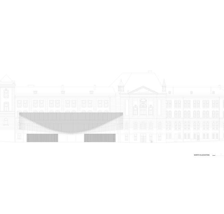 La sede del Politecnico di Jihlava, un edificio di tre piani con cortile interno a pentagono, è un edificio del 1905. Smantellato il tribunale nel 1960, l’edificio ospitò aule universitarie fino alla fondazione del Politecnico nel 2004. Nel 2016 lo studio ceco Qarta architektura è stato incaricato della progettazione di un nuovo auditorium sul terreno libero sul fronte nord della sede universitaria, allo scopo di aggiungere una sala conferenze più capiente di quella già presente all’interno del palazzo e ospitare così un crescente numero di studenti.