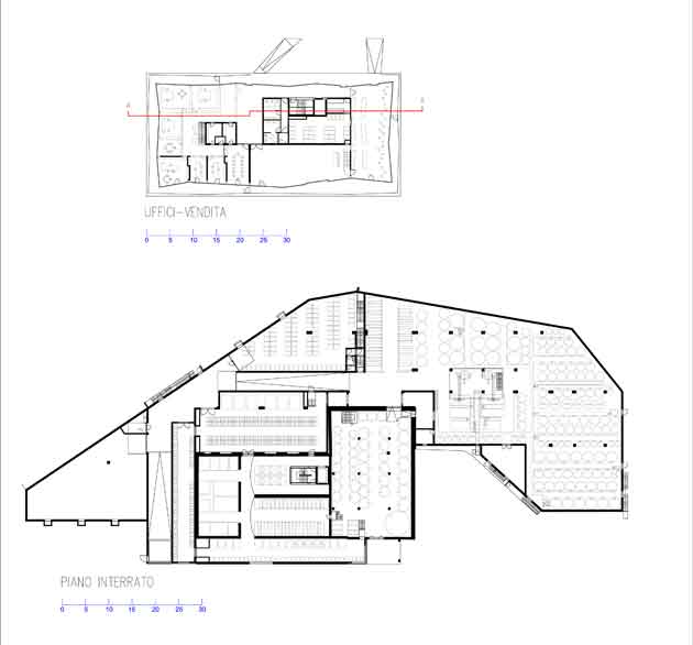 Pianta del piano interrato e del volume superiore vetrato destinato all´area vendita e uffici