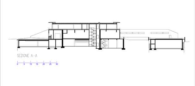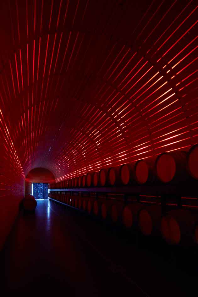 Al mondo sotterraneo destinato alla produzione e conservazione dei vini fa quindi da contrappunto la leggerezza del livello superiore, una scatola trasparente con struttura orizzontale in legno lamellare e profili verticali in metallo avvolta da una superficie vetrata dall’andamento spezzato e coronata sui quattro lati da una cornice aggettante. Accessibile dalla strada superiore, il nuovo padiglione vetrato accoglie su un unico piano tutti gli uffici amministrativi e gli ambienti destinati al pubblico per la presentazione, la degustazione e la vendita dei vini, eliminando in questo modo ogni interferenza con le attività della cantina. Nei due livelli sottostanti, l’ultimo dei quali interrato, sono state riorganizzate tutte le funzioni necessarie alla produzione vinicola, dall’accesso per il conferimento delle uve all´area produttiva alla bottaia, inclusi i magazzini e i parcheggi per dipendenti, collaboratori e visitatori.