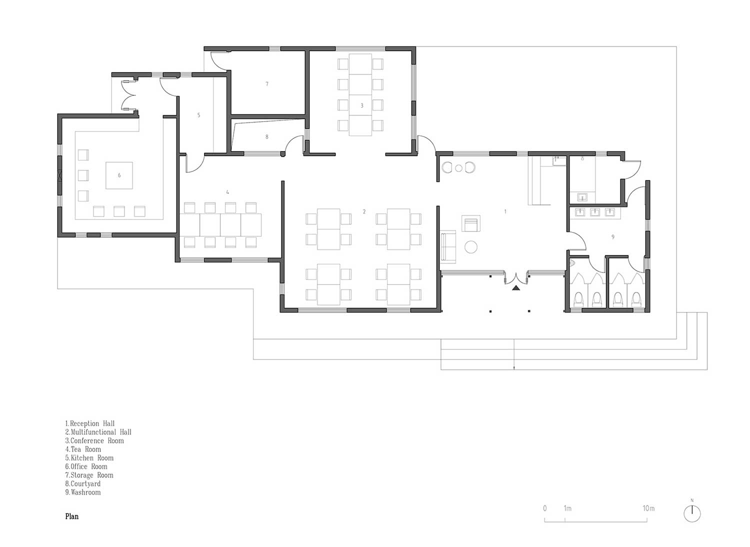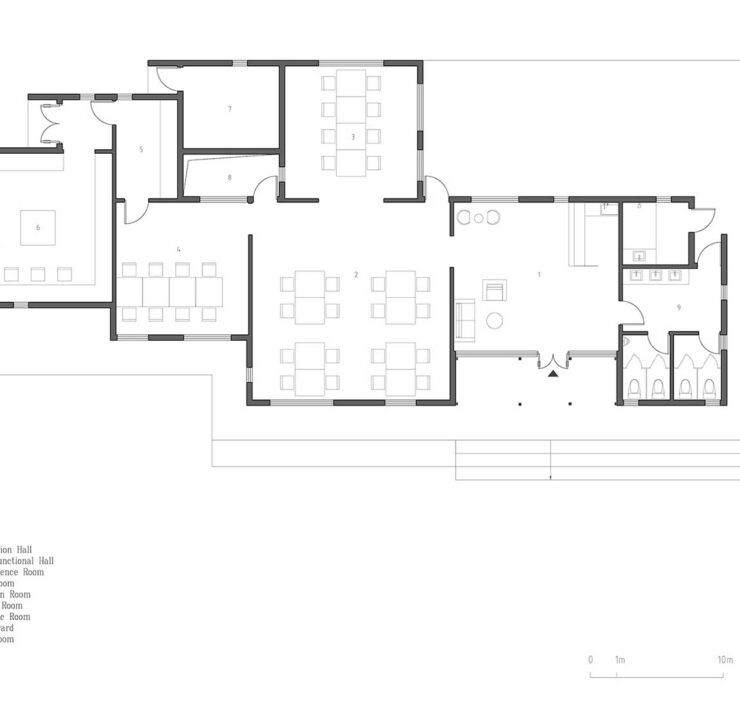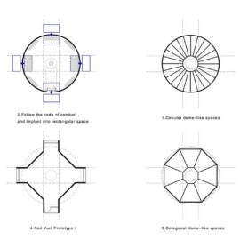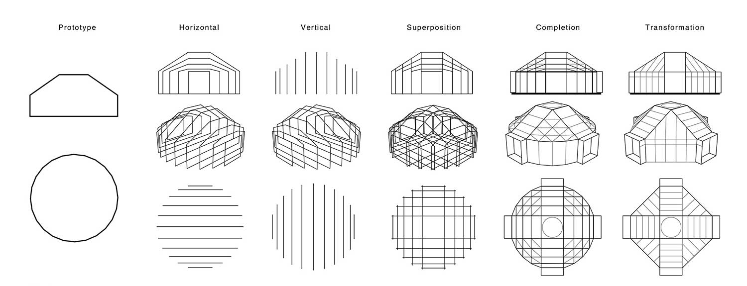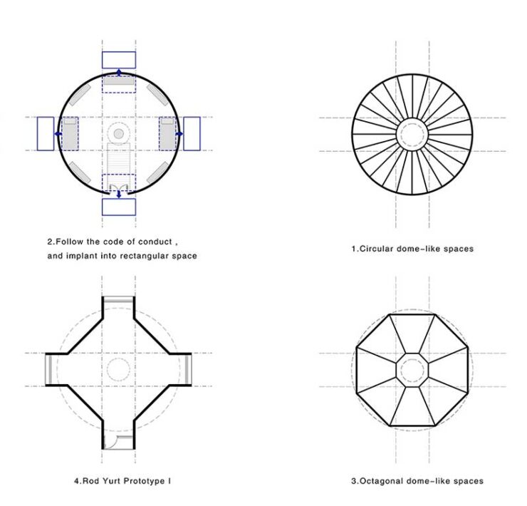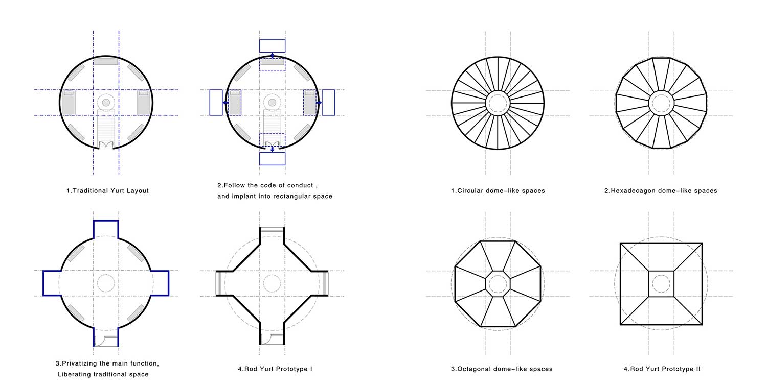 Riflesso del mondo spirituale dei popoli nomadi e ingegnosa risposta al clima e alle esigenze pratiche, lo spazio a forma di cupola della tradizionale jurta viene ereditato da Ger Atelier attraverso una ricostruzione geometrica. I moduli unitari e un meccanismo di espansione combinato sono incorporati nell’organizzazione della pianta per creare uno spazio architettonico più vario e aperto.