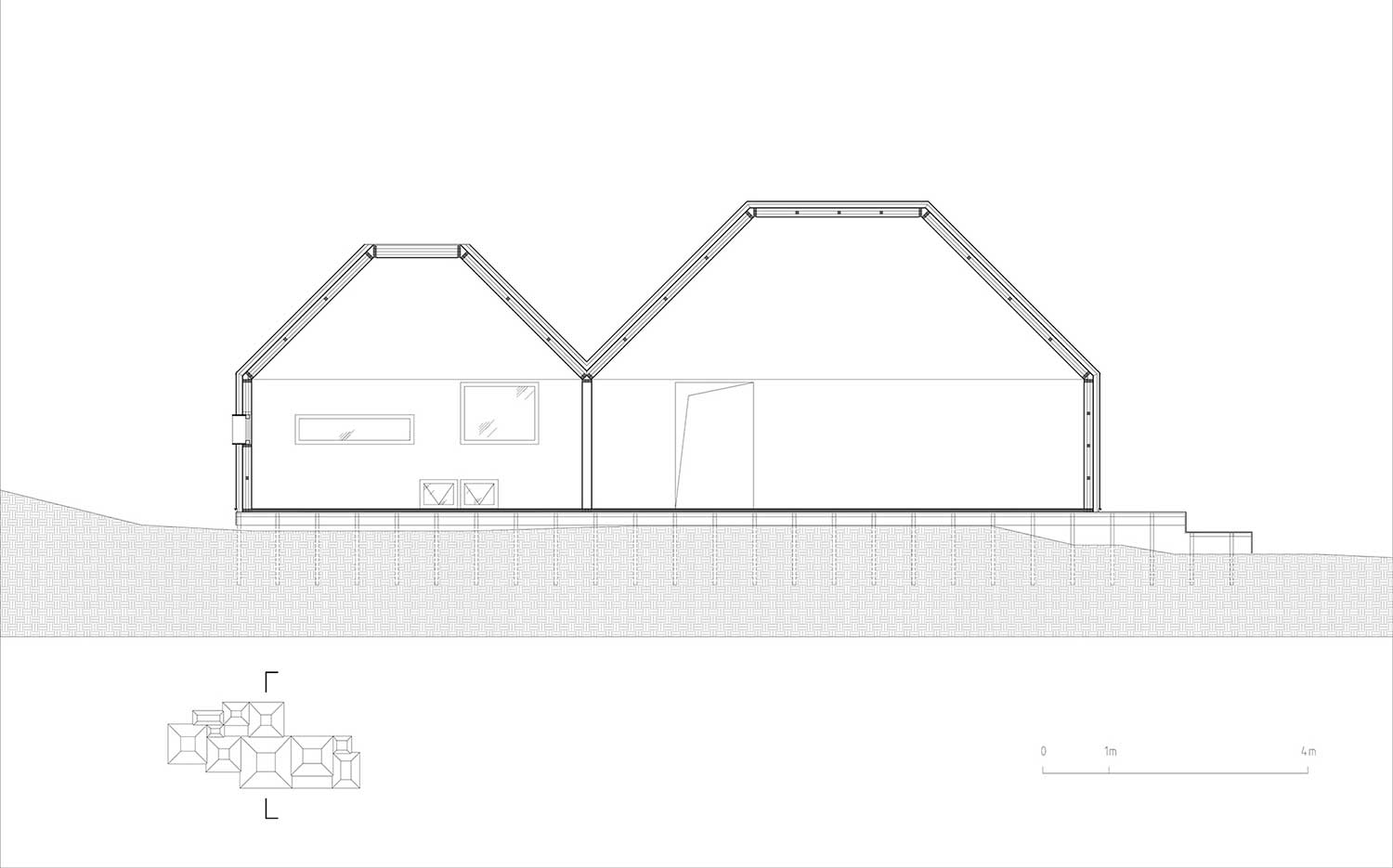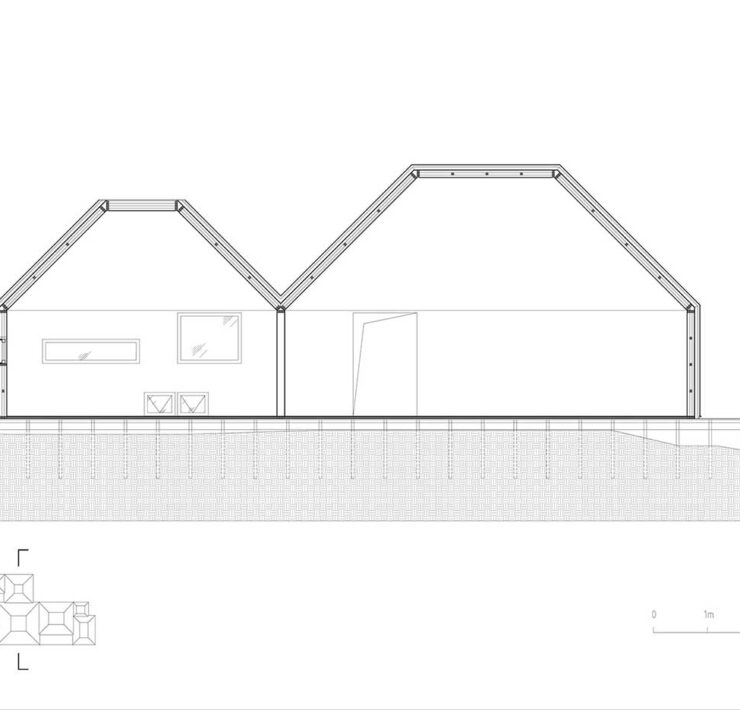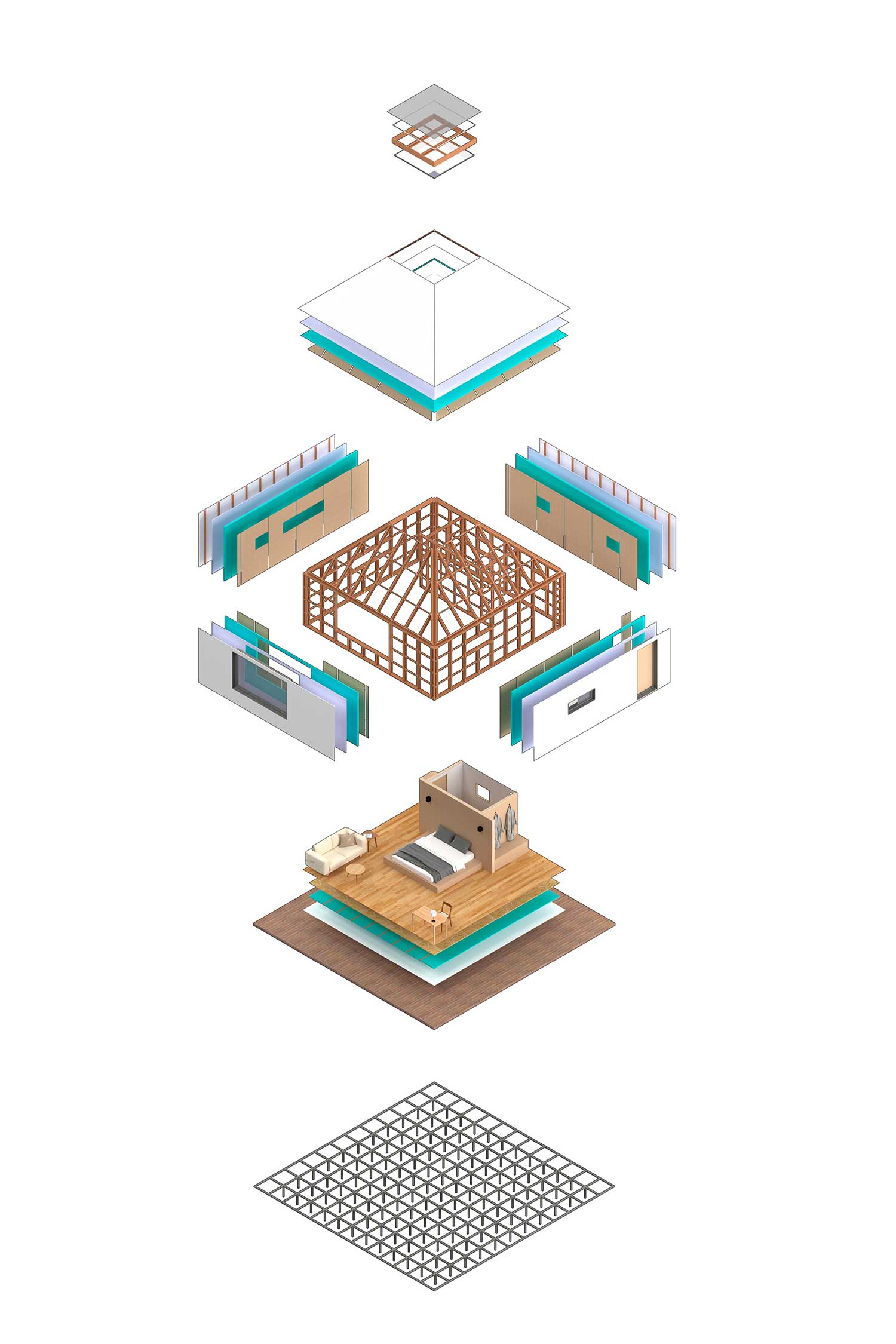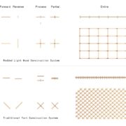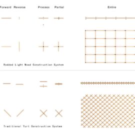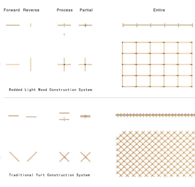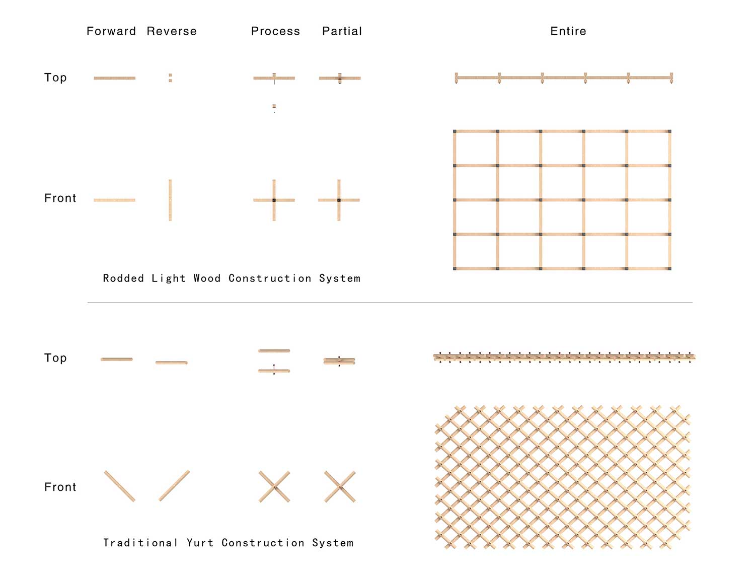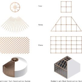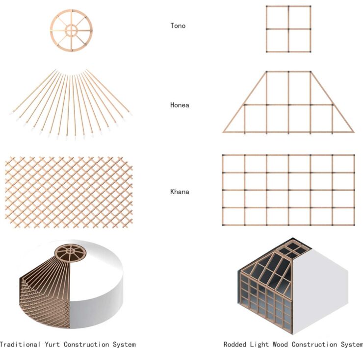 La struttura è formata da pali di legno a sezione ridotta integrati e incollati, sovrapposti ortogonalmente, mentre l’involucro tradizionale – realizzato attraverso la legatura di piccoli rami di salice, pelli e corde di cuoio – si evolve in un sistema strutturale assemblato: i ramoscelli di salice e le corde di cuoio sono sostituiti da pali di legno incollati e da componenti prefabbricati in acciaio, che combinati in una logica ortogonale danno vita un sistema strutturale leggero ma stabile.