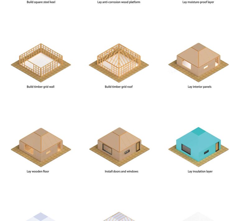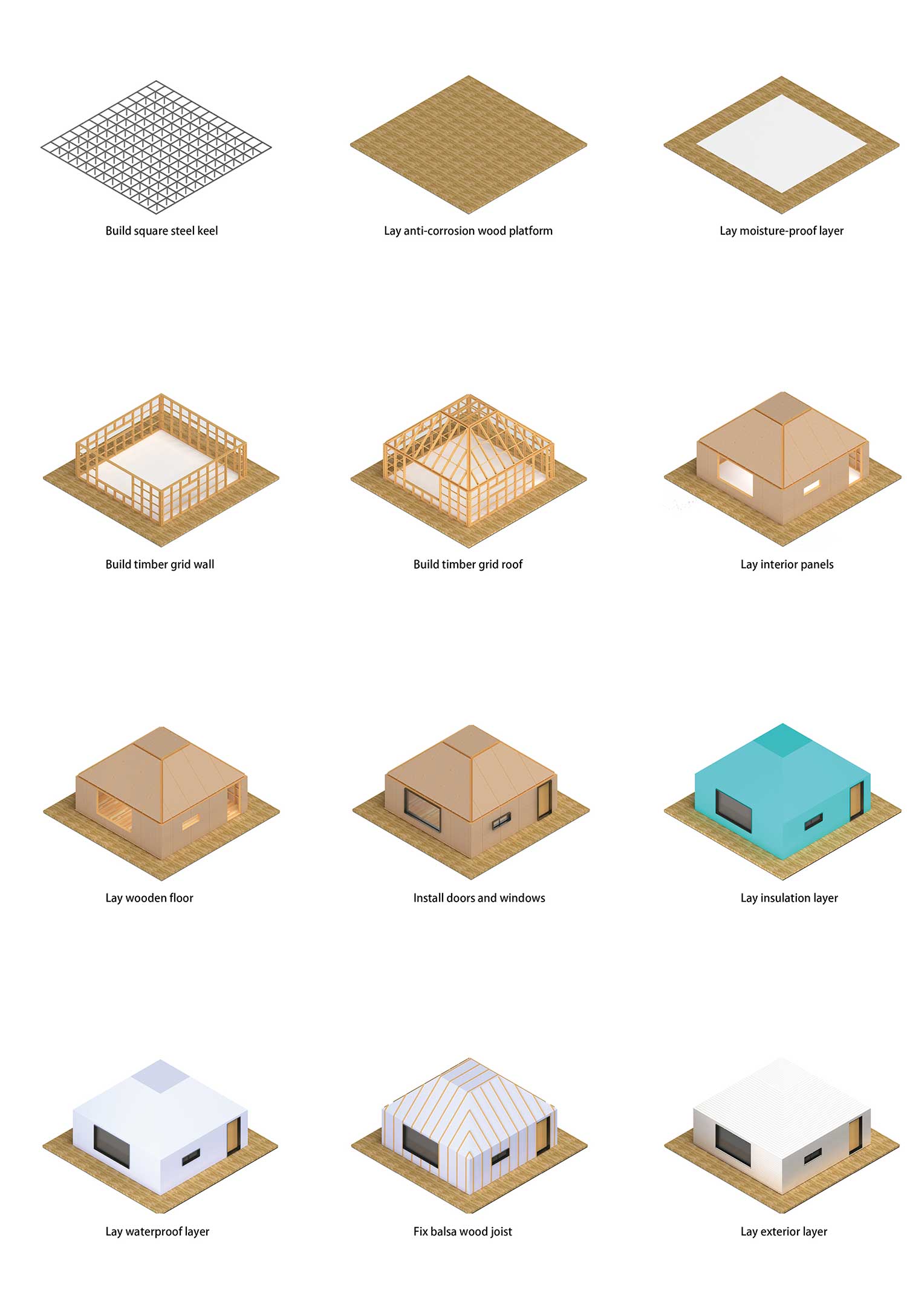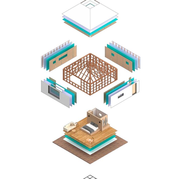 Tutto viene prefabbricato offsite e assemblato in loco. Le sezioni strutturali e il peso complessivo ridotti consentono una rapida costruzione e installazione senza la necessità di grandi attrezzature meccaniche.