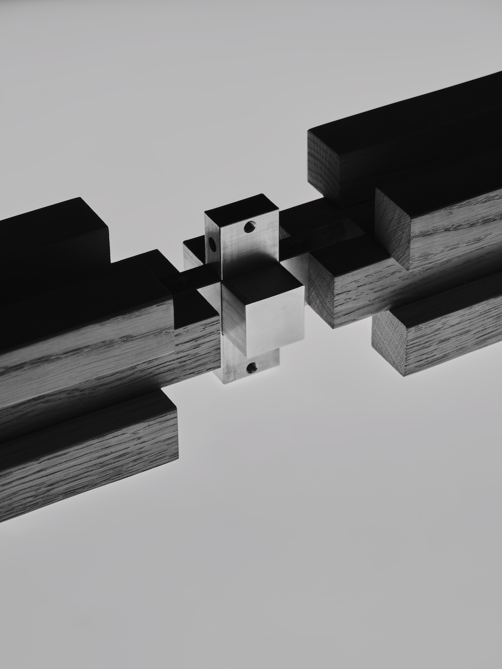 Il sistema costruttivo si basa su un giunto in alluminio che connette una struttura lignea leggera, permettendo configurazioni variabili nello spazio e l’adattamento a contesti e funzioni differenti. Lo stand diventa così un prototipo replicabile, capace di evolvere da installazione a edificio. Anche l’illuminazione, sviluppata con Platek, è parte integrante dell’architettura.