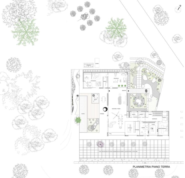 La copertura in scandole di larice della villa di 500 mq e il rivestimento ligneo a parete uniti a pietra, vetro e corten completano l’immagine esterna dell’edificio che si amalgama nel parco dove giardini di ispirazione orientale legano i vari fronti dell’edificio.
