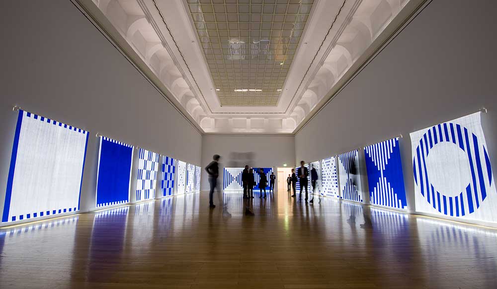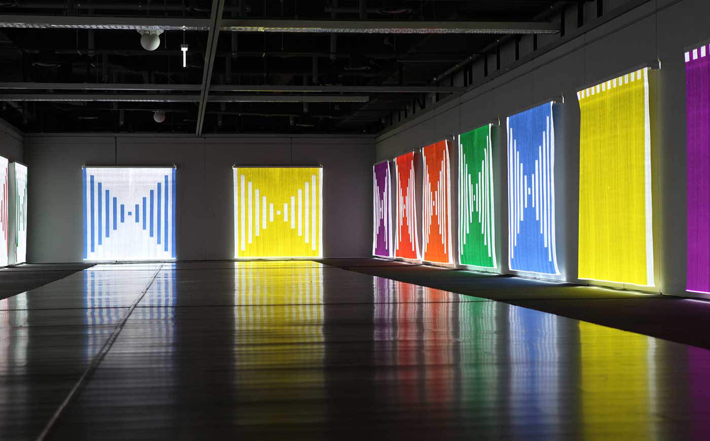 I teli in fibra luminosa sono l’esito ultimo della ricerca di Buren, la parte recente e aggiornata di un percorso creativo originale e celebrato. Essi non rappresentano soltanto l’evoluzione tecnologica di concetti e principi compositivi consolidati, ma costituiscono, a tutti gli effetti, una nuova condizione costruttiva, un nuovo modo di esistere nello spazio, in ragione delle loro peculiari qualità intrinseche, del loro essere portatori interni di sostanza raggiante e, allo stesso tempo, fonte di luce per gli ambienti.