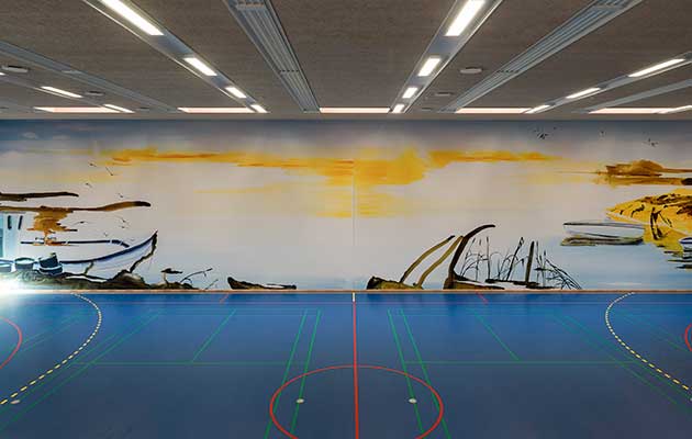 La palestra per le attività sportive con campi di badminton, pallacanestro e pallamano(foto, Torben Eskerod) |