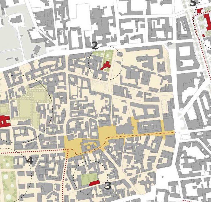 L’accesso principale, per chi proviene dal centro cittadino, avviene attraverso un vicolo che sfocia in un giardino interno, mentre un ingresso secondario si apre su via De Gasperi.