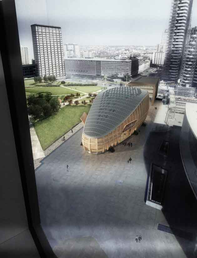 Una struttura in centine di legno lamellare permette di non avere colonne all’interno. Gli impianti saranno integrati all’interno dell’edificio, alto tra 9 e 22 metri. La copertura sarà realizzata in zinco-titanio con pannelli solari integrati e l’involucro in vetro sarà protetto da brise-soleil automatizzati per garantire il comfort ambientale interno.