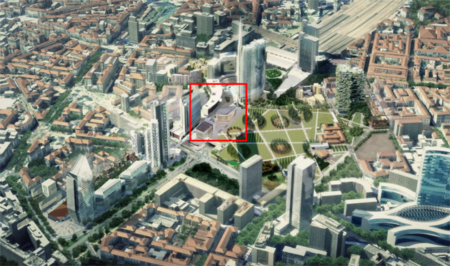 | L´Unicredit Pavilion inserito nel nuovo tessuto urbano di Porta Nuova: la posizione nel masterplan e il prospetto |