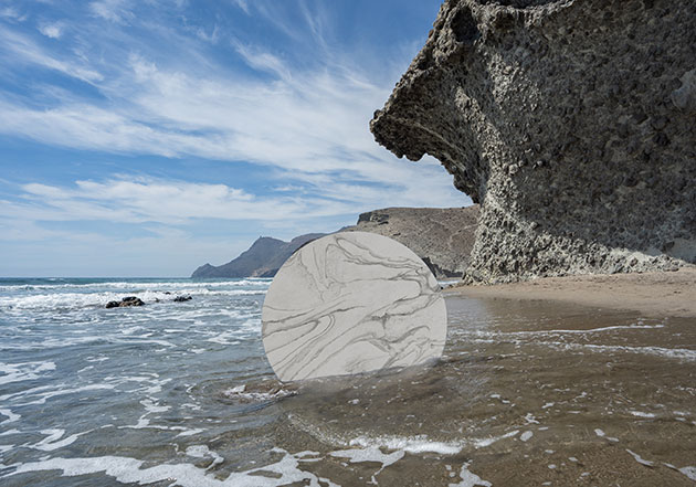 Caratterizzata da un motivo vorticoso e marmorizzato simile a una nuvola, Sky, disponibile anche in lastre circolari) si ispira ai principi della fluidodinamica. La sua base bianca solcata da venature grigie fluide è un inno alla forza di gravità, all’energia e al moto perpetuo.