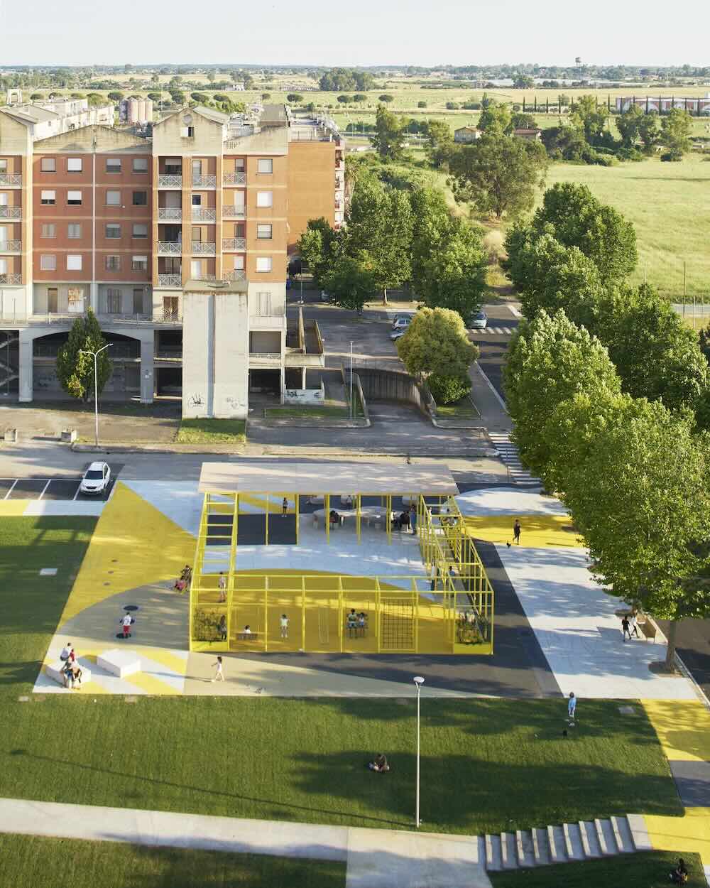 Tra i progetti esposti figurano esperienze che interpretano l’architettura come infrastruttura civica, dal riuso di grandi complessi pubblici come Europarc a Bruxelles, fino a interventi urbani come Prossima Apertura ad Aprilia di studio Orizzontale, nati da processi di negoziazione e coinvolgimento diretto delle comunità.