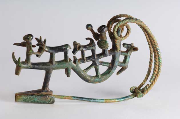 La fibula di Pizzoli, con figure e animali a tutto tono, databile all´VIII secolo a. C. ritrovata nel 2008 a Pizzoli (L´Aquila) nella tomba 45, scavo in località Scentelle – Capaturo. Bronzo; cm 5,2 x 8,8. Chieti, Museo Archeologico Nazionale, Villa Frigerj (Polo museale dell´Abruzzo, foto Mauro Vitale, Soprintendenza Archeologia Abruzzo) |