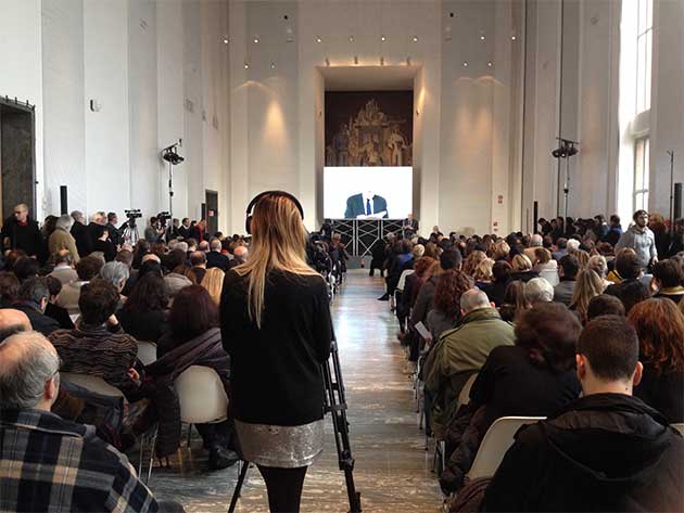 Il salone d´onore del Palazzo dell´Arte affollato alla presentazione di ieri |