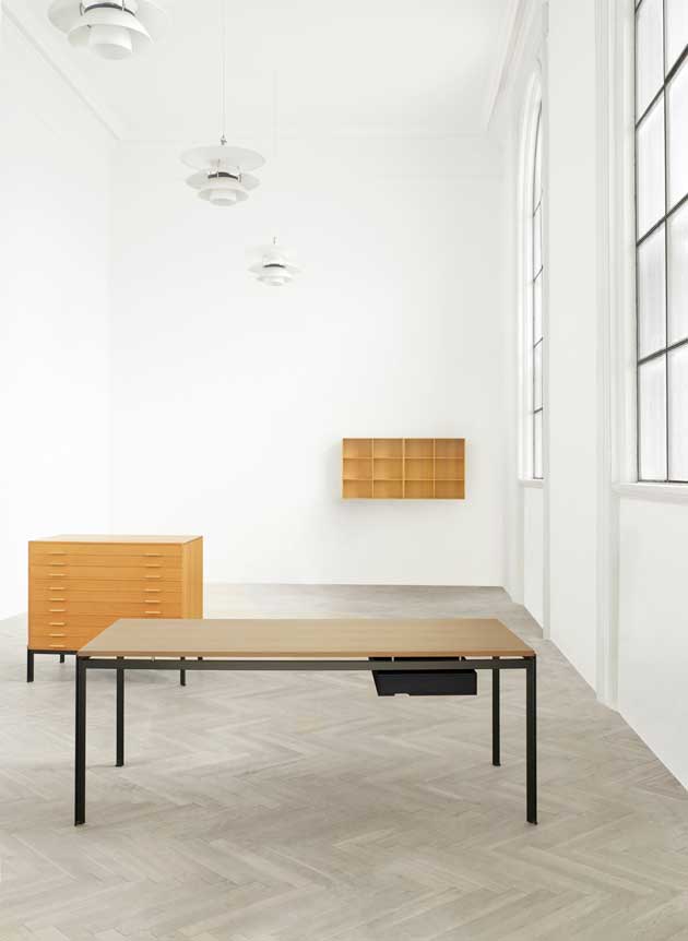 | Carl Hansen & Søn, scrivania Professor PK52 in rovere con cassetti in rovere nero, cassettiera e libreria da parete in rovere, design Poul Kjaerholm |