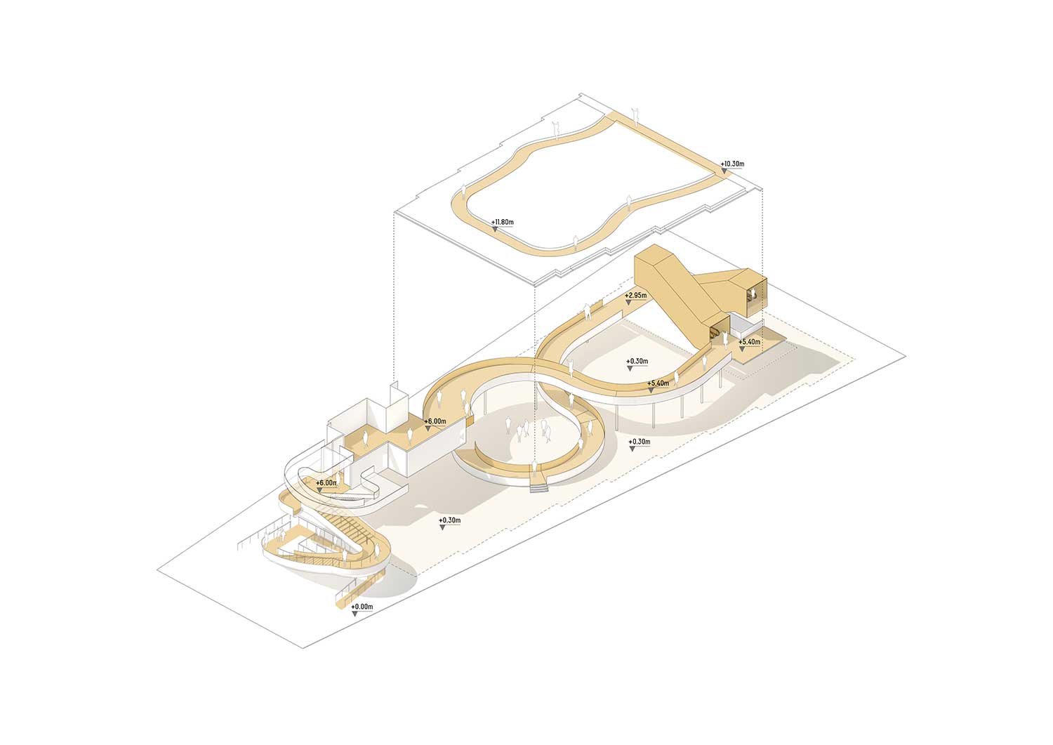 Così, il padiglione francese sarà un ‘Theatrum Naturae’: una scena in tre atti che inizia con una scalinata curva – dai render sembrerebbe in rame – e conduce ai giardini della terrazza in copertura, che con la vegetazione narra i diversi ambienti naturali della nazione, dalle coste del nord alla montagna al Mediterraneo. Nella scena finale il percorso ridiscende a terra.