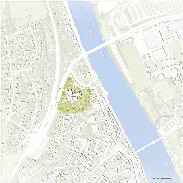 Il progetto paesaggistico di Capatti Staubach tiene conto del dislivello esistente e prevede una serie di percorsi che permetteranno di raggiungere il nuovo complesso direttamente dal fiume.
