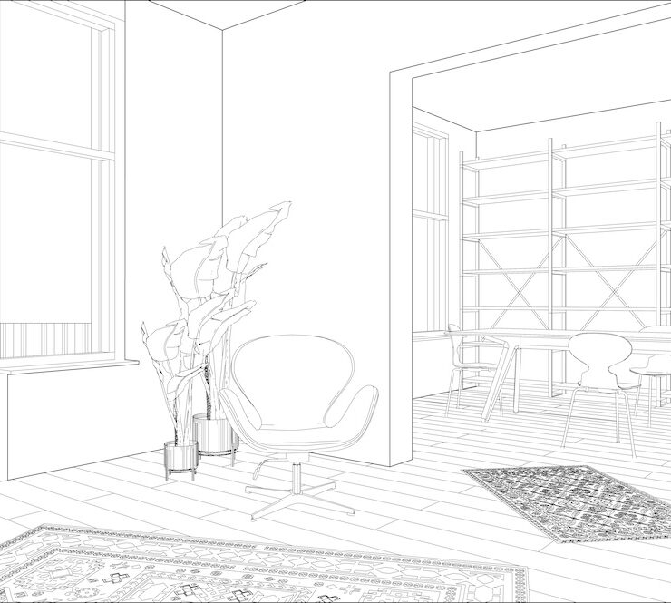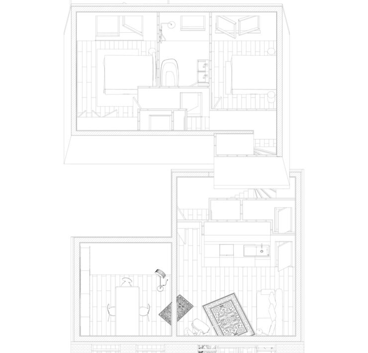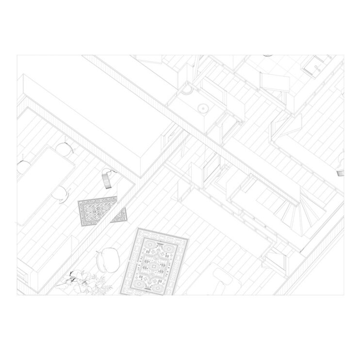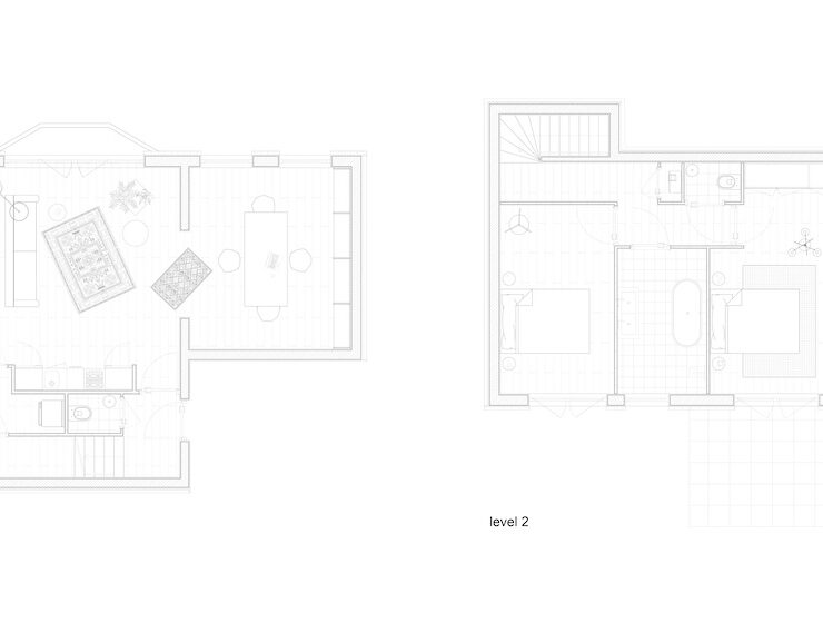 L’appartamento, in condizioni complessivamente buone, non richiedeva operazioni radicali. Il progetto si è quindi concentrato su alcuni gesti mirati: l’unificazione al primo piano di due ambienti in un unico soggiorno con spazio studio; il ridisegno della scala per migliorare la comunicazione verticale; l’inserimento di armadiature integrate nella zona notte; la trasformazione di una porzione di copertura in un piccolo balcone. L’intervento ha restituito fluidità e leggerezza, mantenendo intatto il rapporto con la struttura storica.