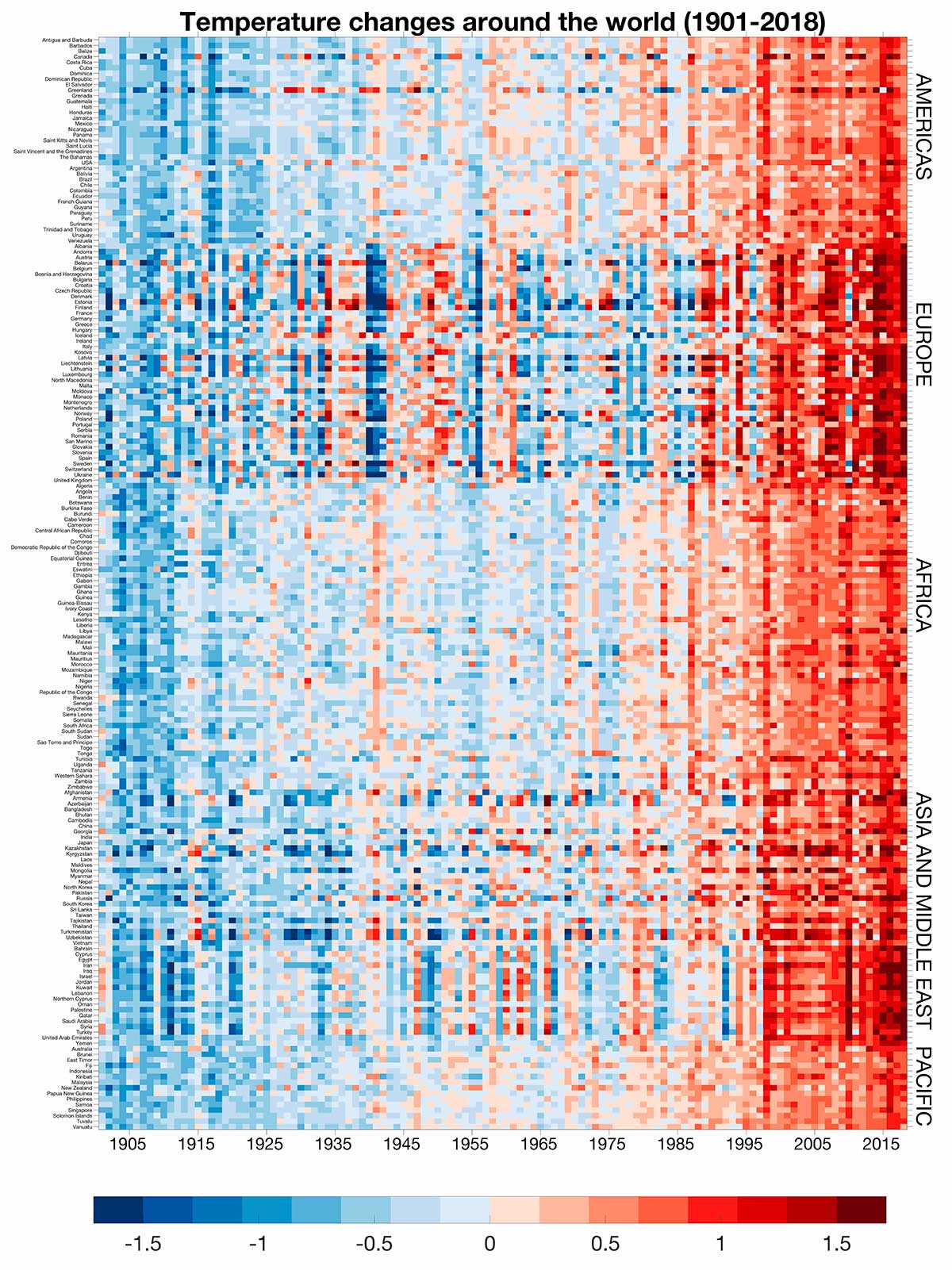 In questo diagramma, realizzato dal professore Ed Hawkins per la BBC, attraverso l’uso del colore viene rappresentato il cambiamento climatico in varie parti del mondo nell’ultimo secolo. Più ci si avvicina all’epoca contemporanea, più le temperature rispetto alla media annuale aumentano.