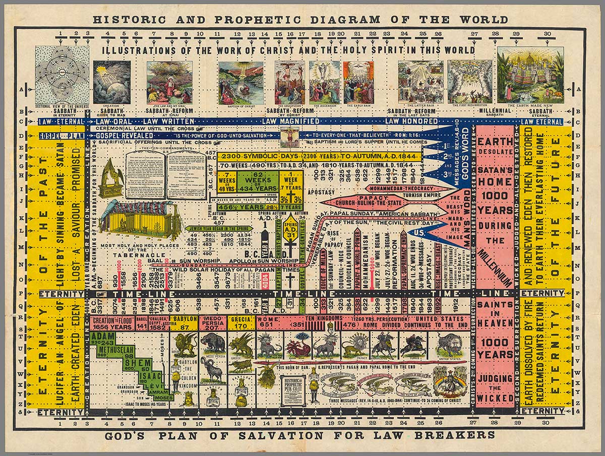 Questa tavola riassume in forma diagrammatica la storia dell’umanità secondo una prospettiva teologica cristiana, offrendo anche una profezia escatologica sul futuro. Ogni evento, data o fatto rappresentato è legato ai numeri da 1 a 30 in alto e in basso e alle lettere da A a Z ai lati, che rimandano a una trattazione completa nel volume a cui questo grafico era allegato.