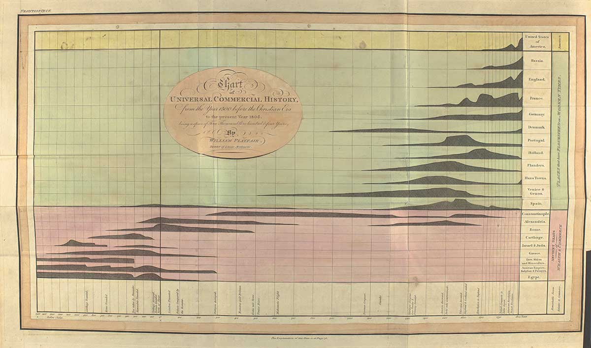 All’inizio del secolo l’avvento di nuove tecniche di stampa ha coinciso con la rapida diffusione dell’istruzione. In questo contesto storico, l’educatrice femminista americana Emma Willard (1787-1870) ha pubblicato libri di storia e geografia includendo mappe del tempo innovative e creative che semplificavano la traduzione di dati e informazioni in una forma visiva più comprensibile.