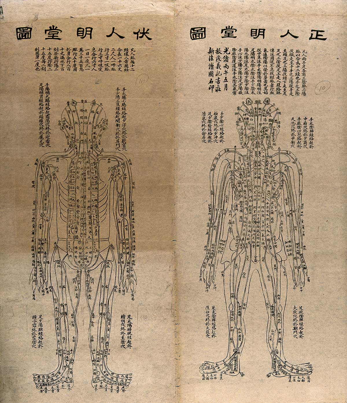 In questa tavola xilografica, su due figure umane stilizzate vengono riportati i meridiani energetici e i punti di agopuntura utilizzati nella pratica della medicina tradizionale cinese. Le linee che scorrono lungo il corpo rappresentano i percorsi dei meridiani, i canali attraverso cui si dice scorra l’energia vitale.