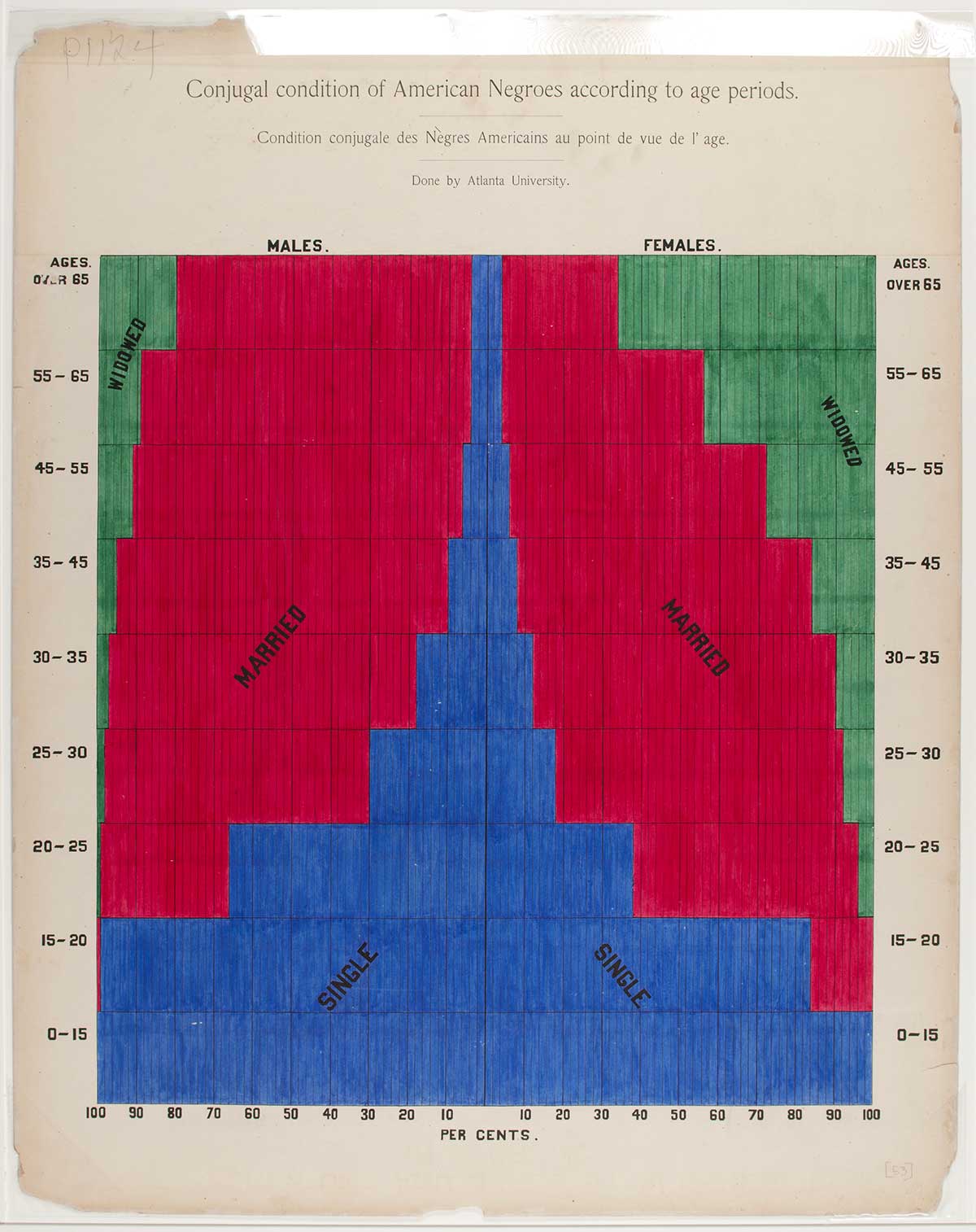 Questo grafico a inchiostro e acquerello fa parte di una serie realizzata da William Edward Burghardt Du Bois (1868-1963) e dai suoi studenti dell’Atlanta University per la “Mostra sui neri della sezione americana” all’Esposizione Universale di Parigi del 1900. Lo scopo della mostra era illustrare lo status e l’avanzamento sociale delle comunità nere dopo l’abolizione della schiavitù negli Stati Uniti nel 1865. Questo diagramma indica la percentuale di afroamericani celibi, sposati o vedovi, raggruppati per età e sesso. Per la modalità avanzata e sintetica di comunicare dati, questo progetto ha rappresentato una pietra miliare nella storia dell’infografica, veicolando consapevolezza sul tema dei diritti civili.