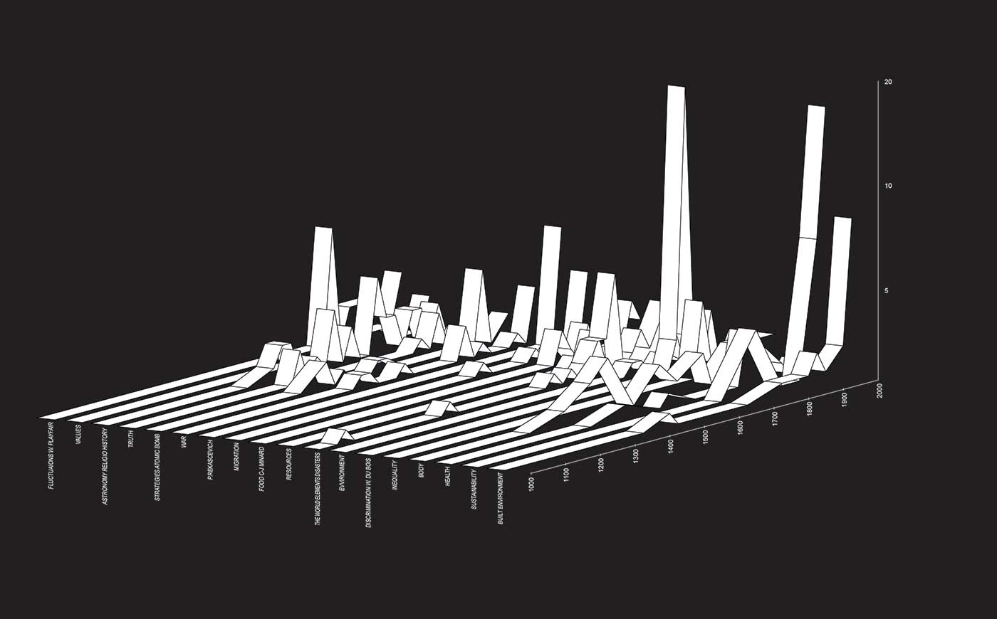 «Dal mio punto di vista – afferma Rem Koolhaas – il diagramma è uno strumento che esiste da sempre. Per esempio, nelle prime fasi della nostra ricerca abbiamo trovato grafici tridimensionali realizzati in Sudafrica intorno al 40.000 a.C. e mappe della costa della Groenlandia intagliate nel legno sull’isola di Ammassalik. Questo dimostra che è una forma durevole di comunicazione che si adatta a qualunque medium esista in un dato momento. E a prescindere dal medium, il diagramma assolve sempre funzioni didattiche (spiegazione) o suggestive (persuasione). In questo senso, non solo esiste di default in qualunque nuovo medium, ma è applicabile a qualunque ambito della vita umana: la moda, la religione, come anche la storia delle diseguaglianze sociali possono essere tutte interpretate in forma grafica. Apprezzo profondamente questa interdisciplinarità del diagramma, il suo attributo invariabile ovvero il fatto di essere indipendente dal linguaggio (le parole) lo rende una delle forme più efficaci di rappresentazione».