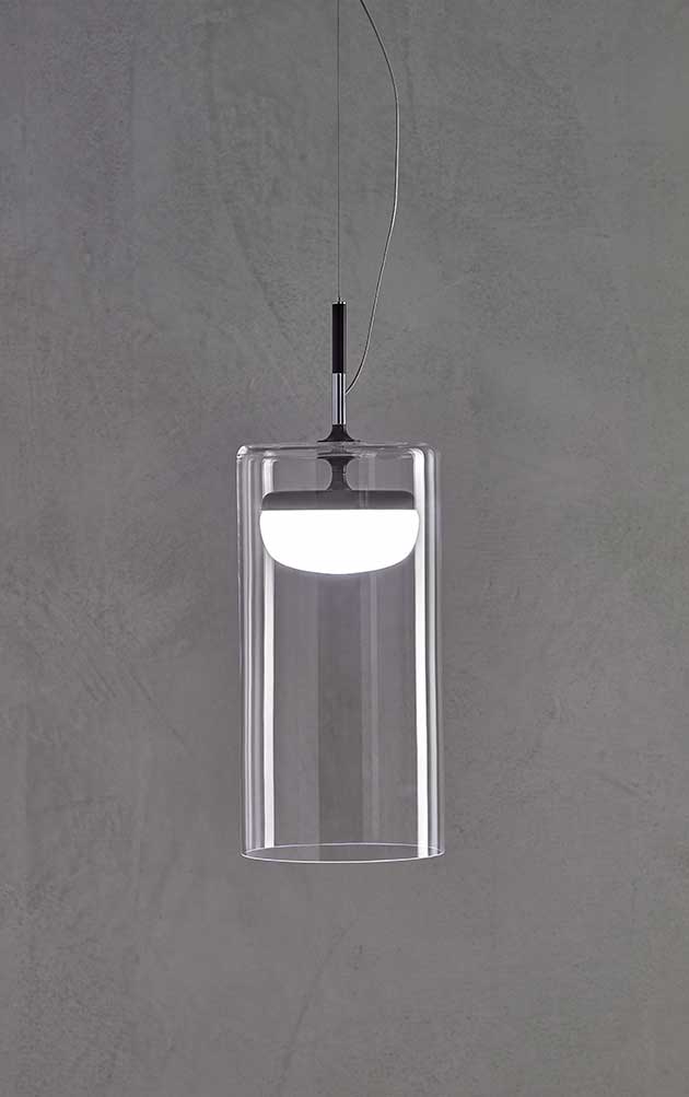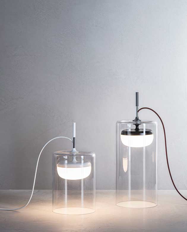 Custodita in un cilindro di cristallo trasparente, la luce di Diver, la nuova collezione di lampade di Prandina, si diffonde attraverso il vetro soffiato opalino che avvolge la sorgente luminosa Led. Due le temperature di colore: 2700K o 3000K.