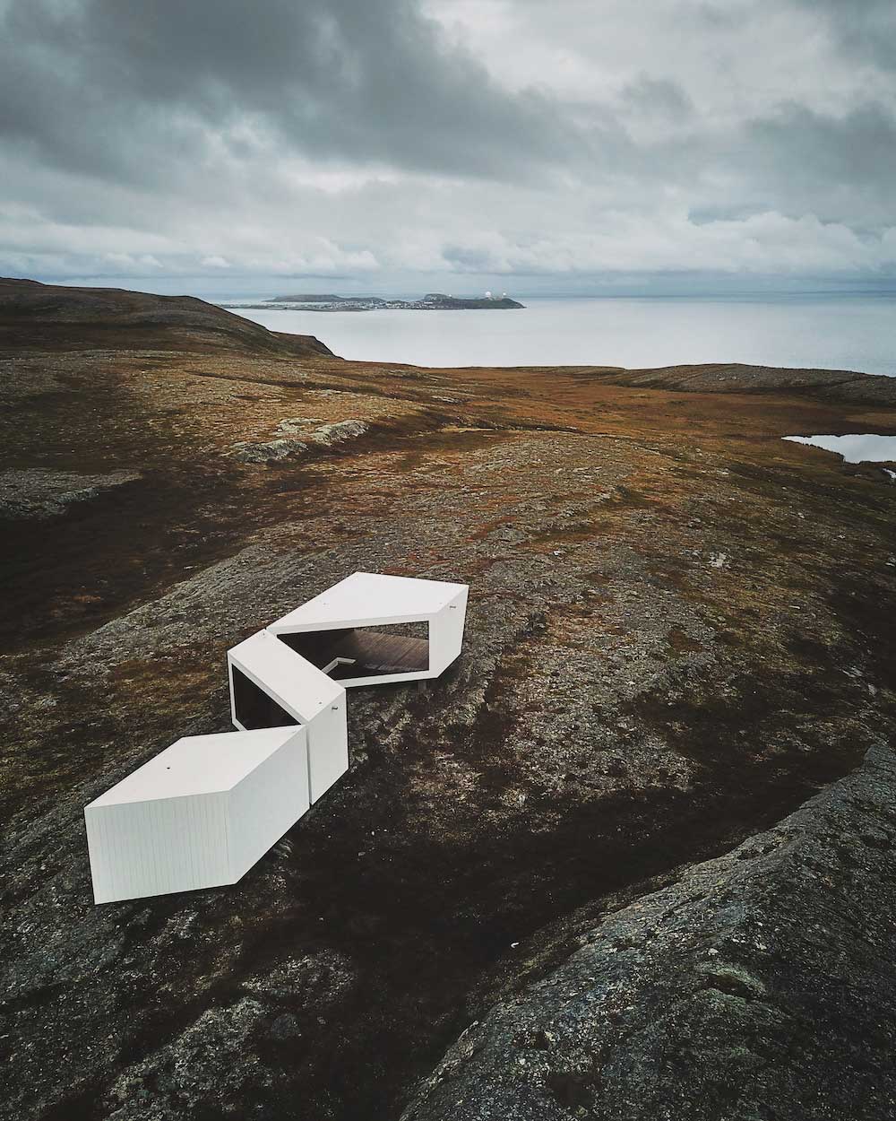 Costruito dall’azienda locale Finnmark Entreprenør e commissionato dalla National Scenic Routes of Norway, il belvedere è composto da tre piccoli edifici rivestiti con pannelli di pino imbiancato a calce per fondersi con il paesaggio dei lunghi e freddi inverni.