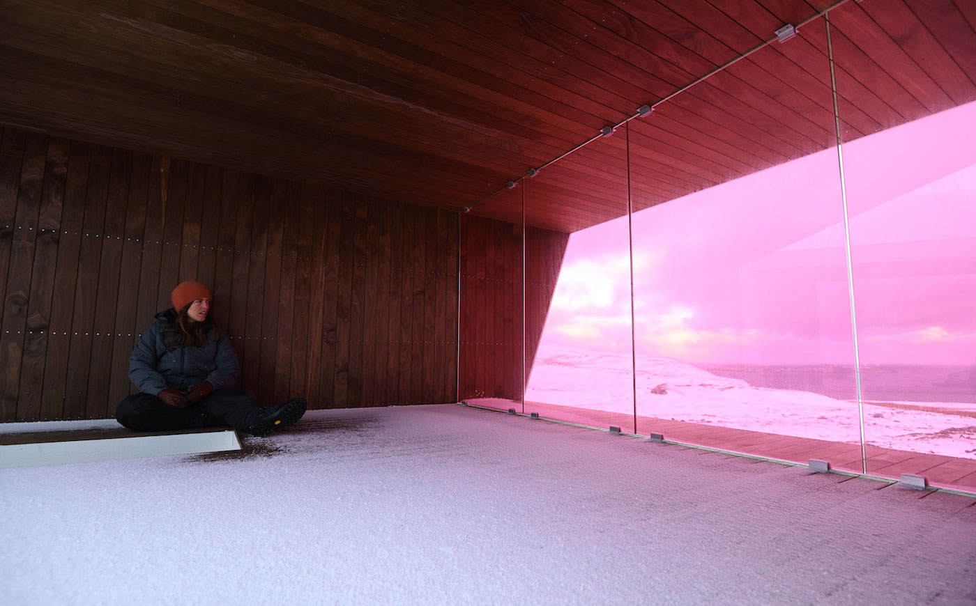 Uno degli ampi vetri panoramici ha una caratteristica sfumatura rosa chiaro. Gli interni sono rivestiti in legno Kebony altamente resistente all’usura e agli agenti atmosferici, scelto dall’architetto Tormod Amundsen, oltre per le sue prestazioni, anche per “la colorazione calda che contrasta molto bene con il paesaggio bianco freddo e il rivestimento esterno”.