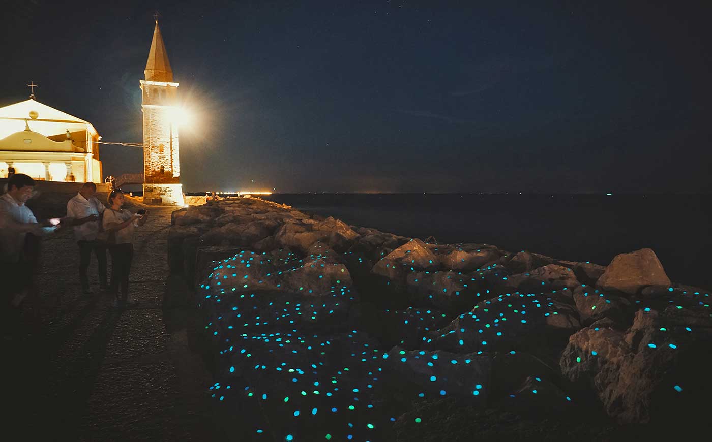 Una costellazione di gocce di vetro fotoluminescenti che assorbono la luce di giorno e la rilasciano di notte trasformano il paesaggio di Caorle. Si tratta di Drops, progetto dell’architetto e inventore italiano Cosimo Scotucci, basato a Rotterdam. L’installazione permanente fa parte de programma culturale promosso da ScoglieraViva – Sculpting the sea e dalla municipalità di Caorle.