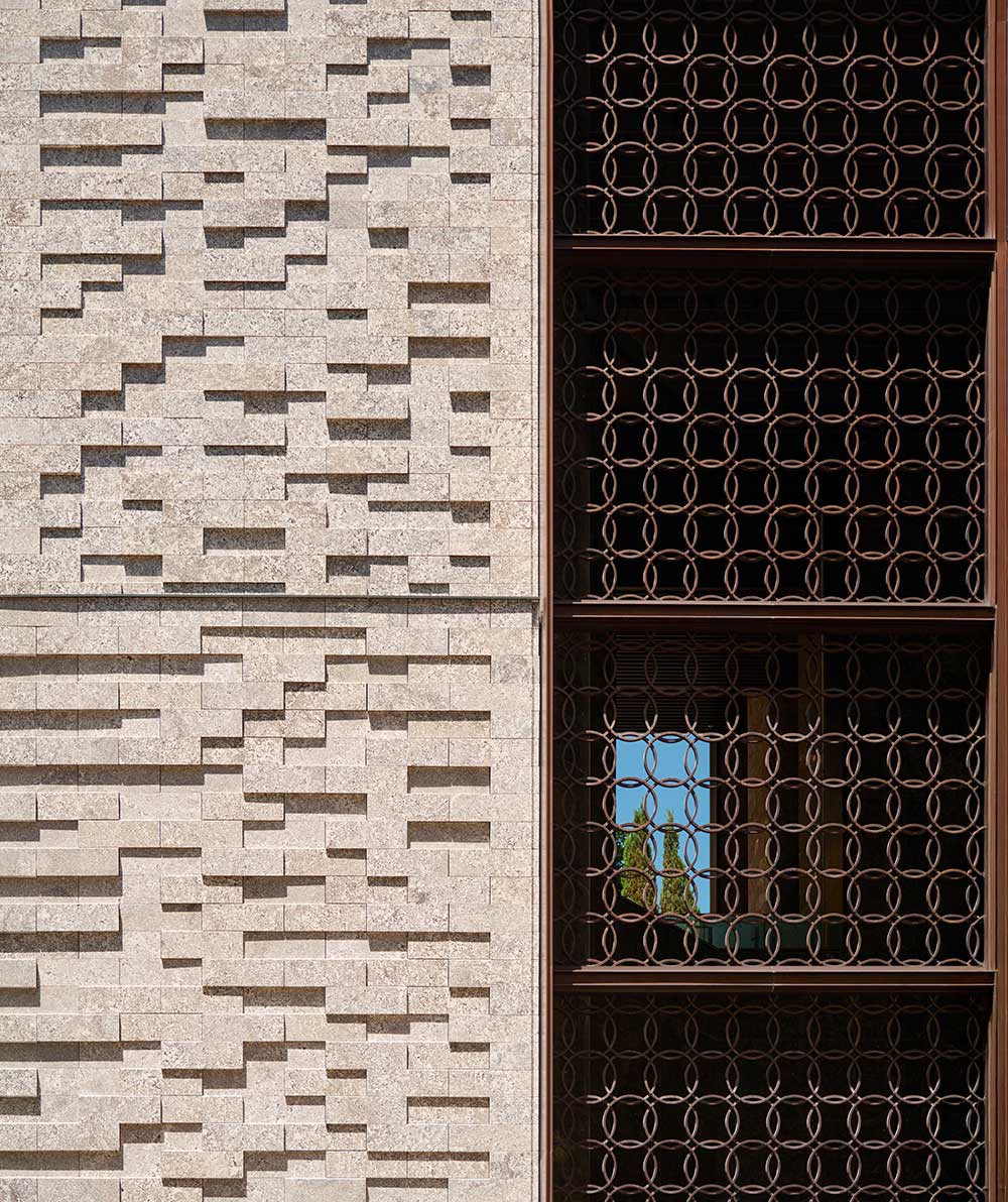 Il podio, interamente rivestito in pietra naturale, richiama le tradizionali mura di contenimento che storicamente hanno sostenuto lo sviluppo urbano sui pendii di Hong Kong.
