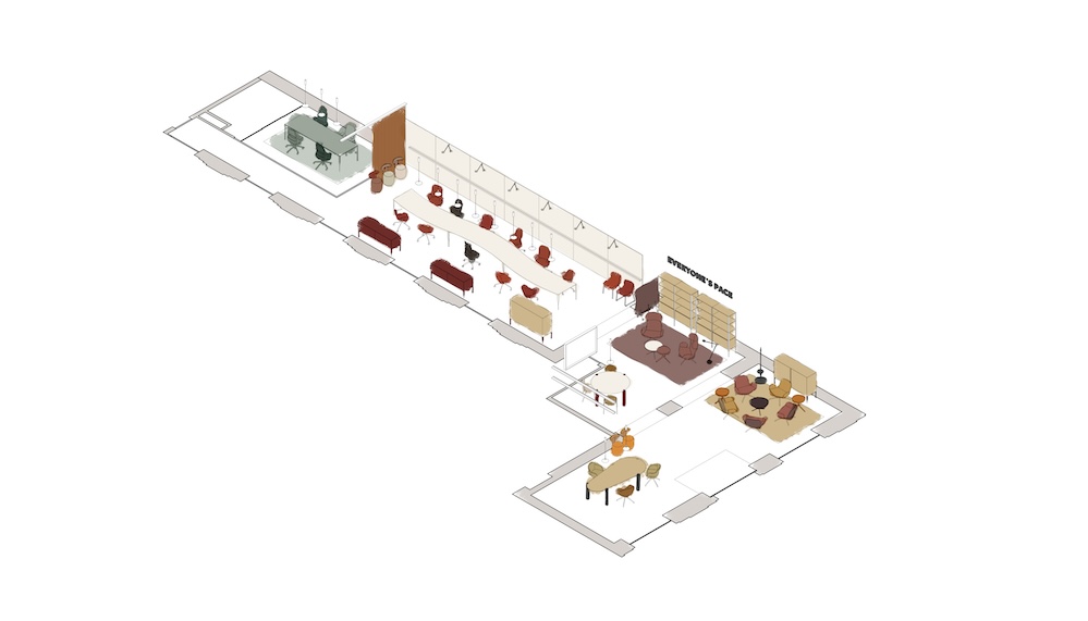 Il percorso si chiude in un open space concepito come studio creativo: qui una configurazione fluida dei tavoli Silhouette costruisce una geometria a onda che organizza lo spazio senza irrigidirlo, lasciando emergere un’idea di ufficio come ambiente aperto e attraversabile.