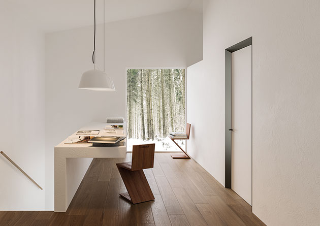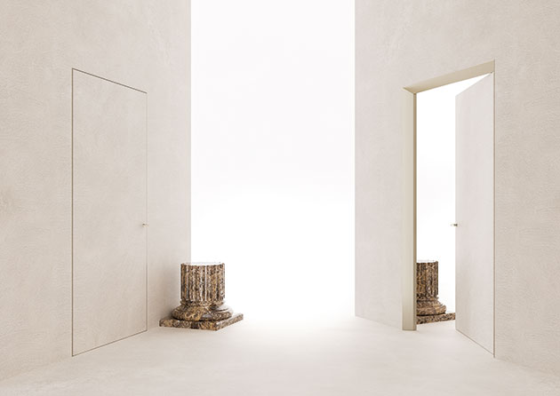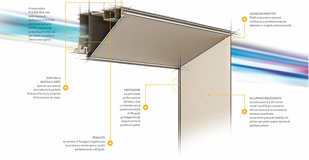 Sviluppato da un’idea di due giovani designer marchigiani, Francesco Valentini e Lorenzo Ponzelli, Eclisse 40 Collection è il primo telaio strombato (40 si riferisce all’inclinazione di 40°) per porte interne, che sull’altro lato rimangono filomuro.