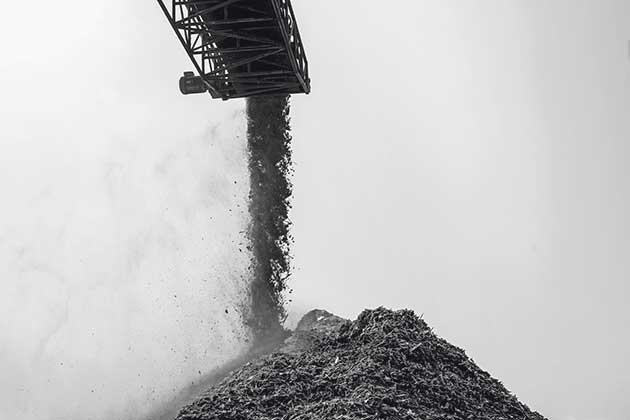 Una delle prime fasi della produzione: dopo essere stato ripulito dai materiali estranei, il legno di scarto viene ridotto in cippato, pronto per entrare nelle linee di produzione dei pannelli truciolari |