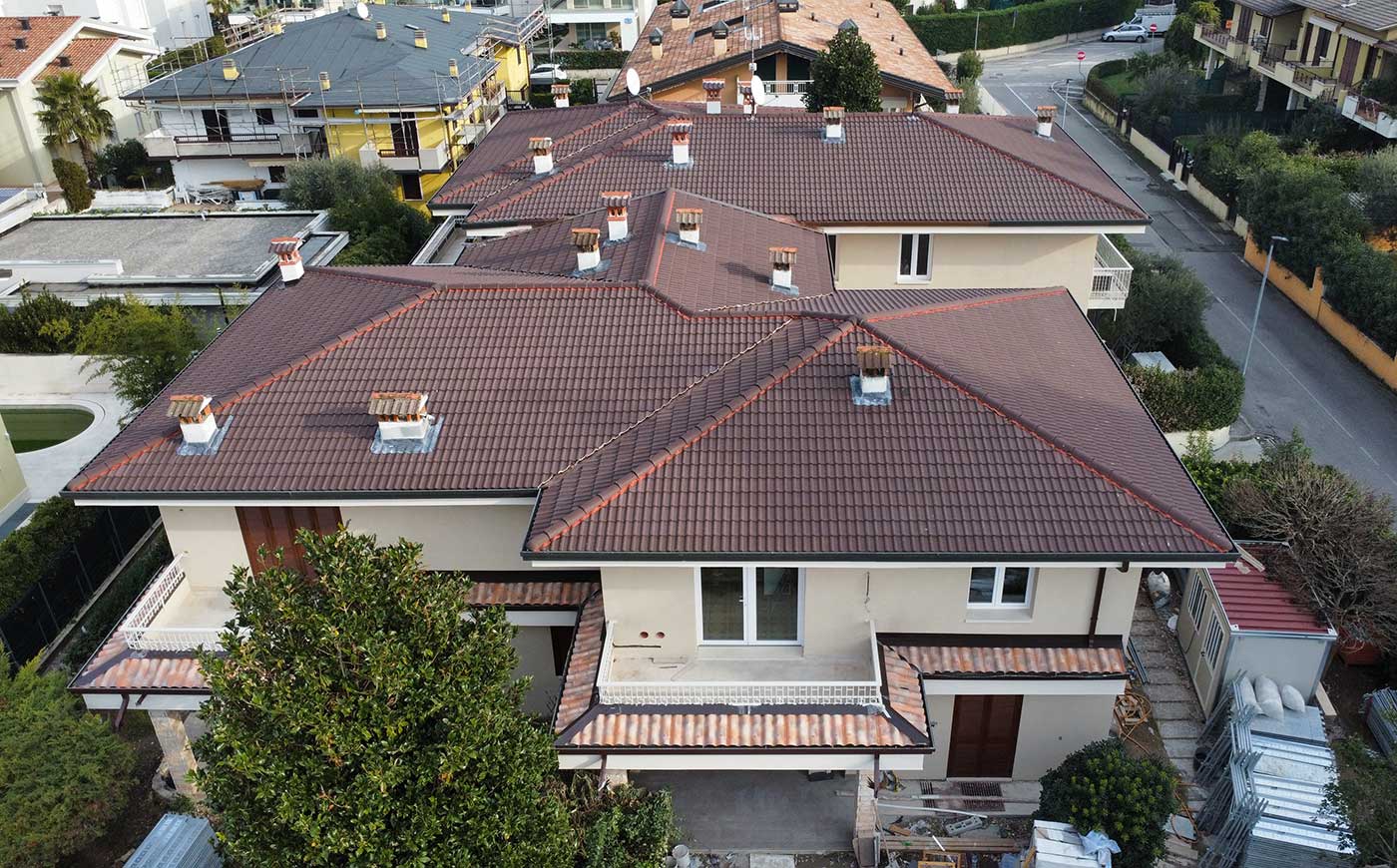 Il tetto esistente, realizzato con una struttura portante a muricci e tavelloni, era del tutto privo di isolamento e di impermeabilizzazione. L’intervento ha preso avvio con la rimozione delle tegole in cemento, che erano fissate con la malta in aderenza ai tavelloni in laterizio. Quindi, si è proceduto alla regolarizzazione della superficie di posa dei tavelloni nudi con malta cementizia, ove necessario, e alla successiva stesura di una guaina impermeabilizzante.